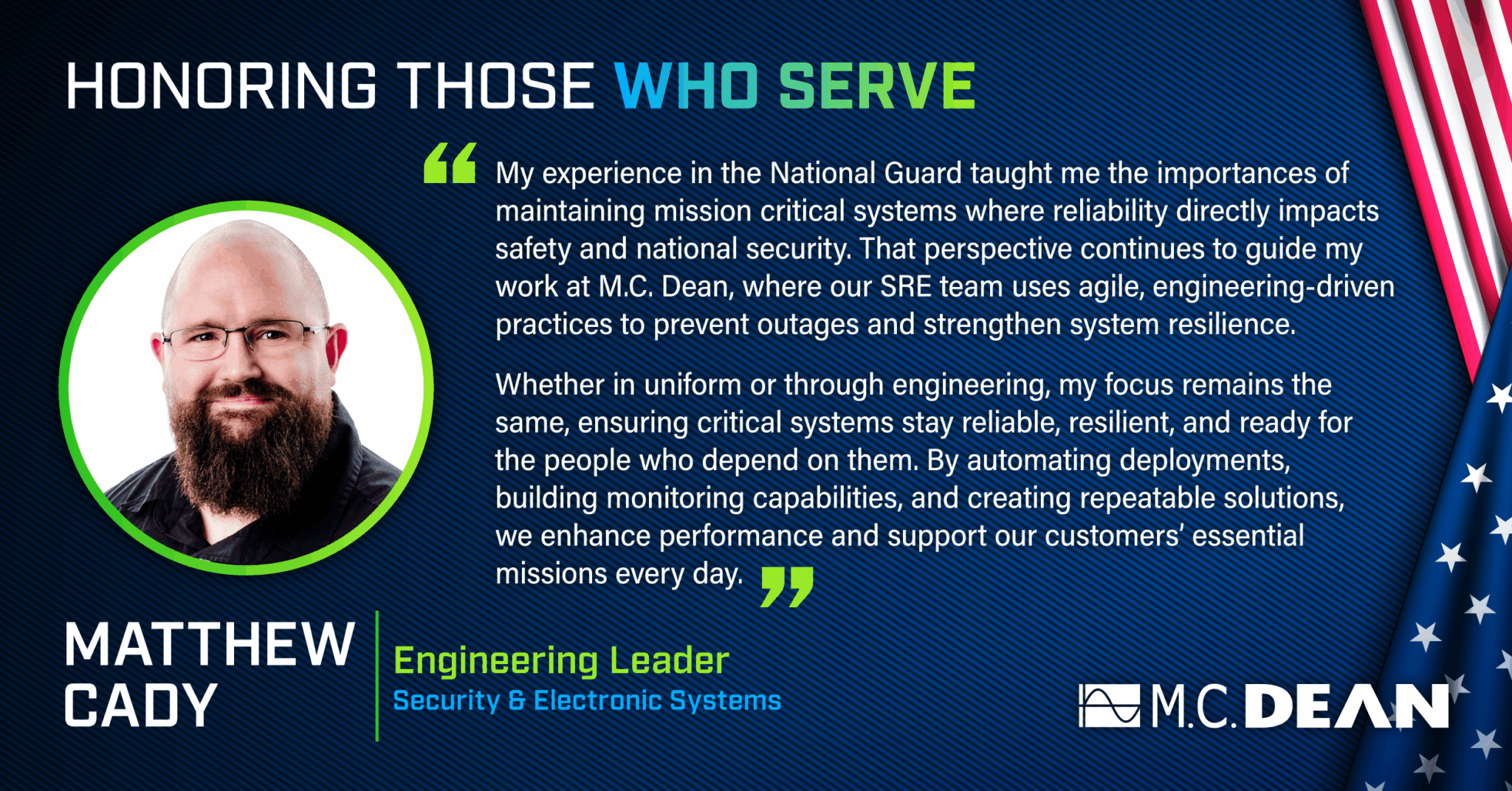 M.C. Dean is recognized for its commitment to recruiting, hiring, and advancing veterans and transitioning service members by connecting military experience to meaningful, long-term careers.